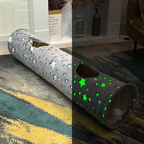 Overview Light up your cat’s playtime with the Glow In The Night Rolling Dragon Cat Tunnel — a magical, interactive playground that shines even in the dark! Made from soft, cozy flannel, this tunnel is perfect for hiding, chasing, and lounging. The glow-in-the-dark patterns (hearts, stars, moons, and more) create a whimsical nighttime adventure your cat will love.