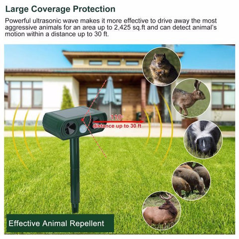 Protect your outdoor spaces naturally and effectively with this advanced ultrasonic animal repeller, designed with motion-activated technology and solar-powered operation. Whether you're dealing with stray cats, raccoons, deer, or rodents, this device offers a humane, chemical-free solution to keep unwanted animals away from your property.